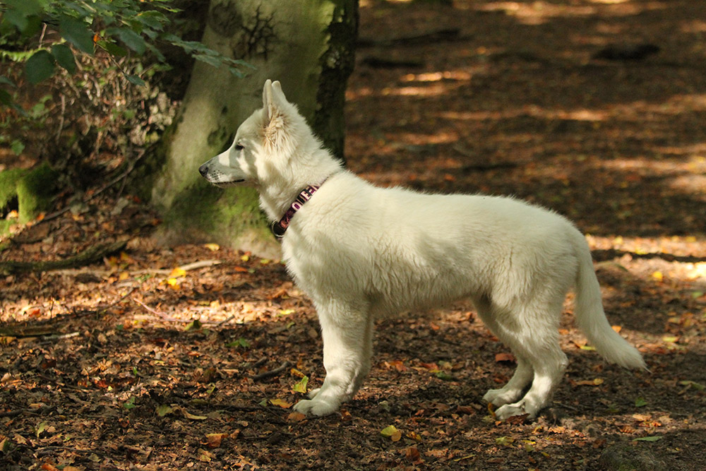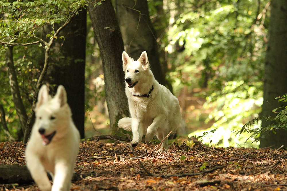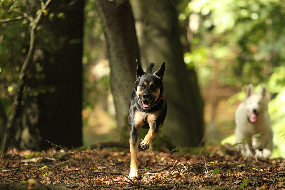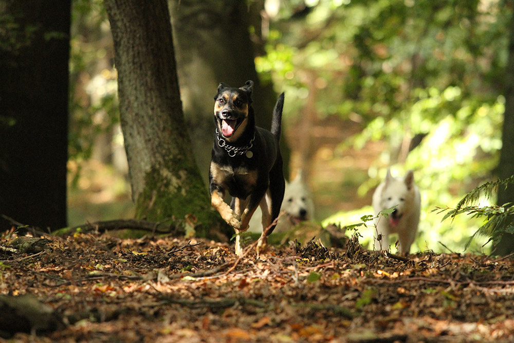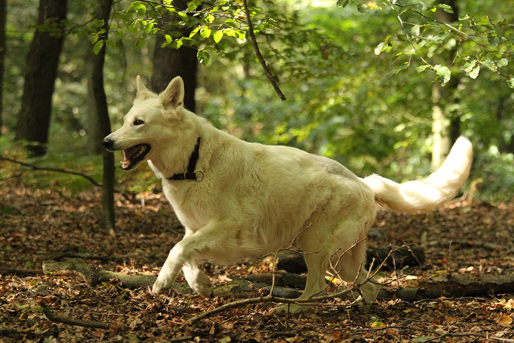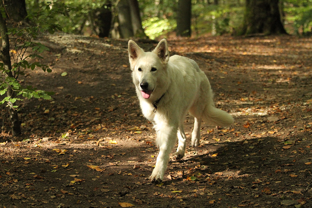 Kaya trabt durch den Sonnen durchfluteten Wald