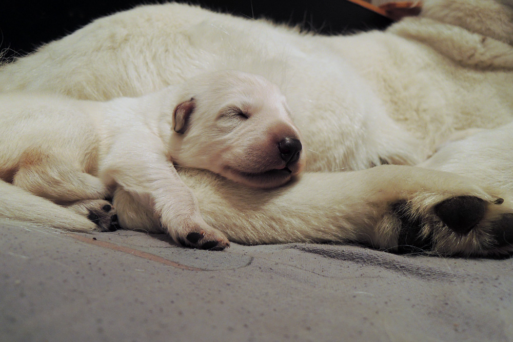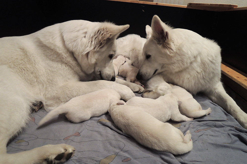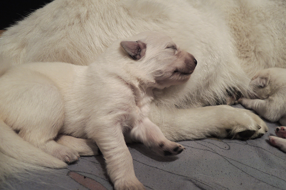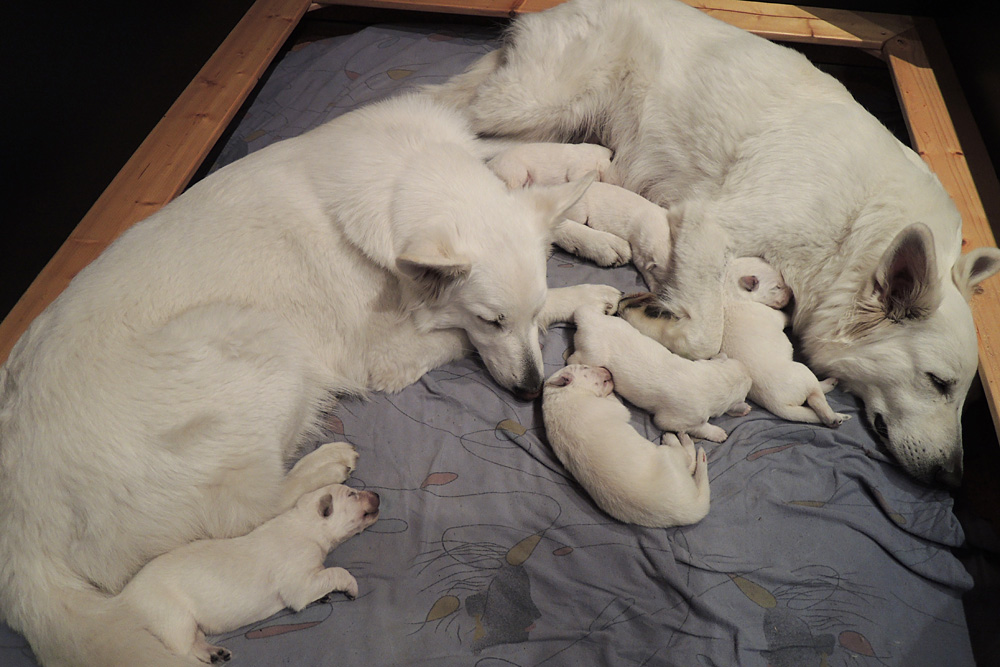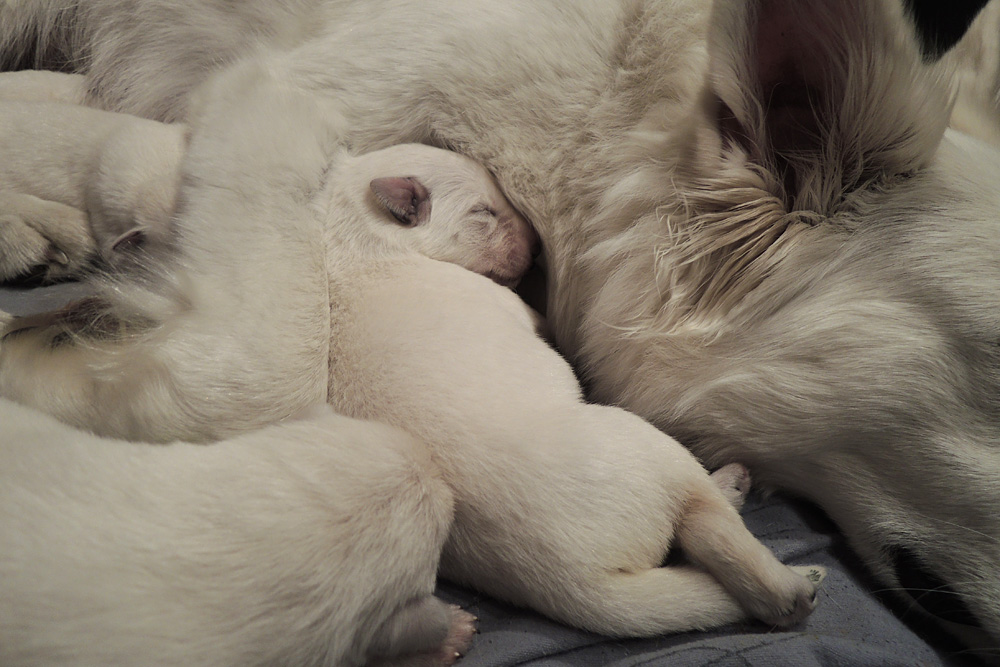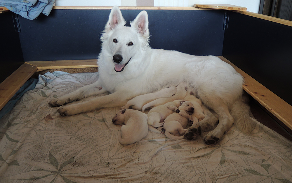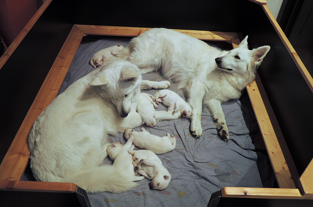 jeder ist schon eine kleine Persönlichkeit...so haben wir eine Krummpumpel Hexe...wenn der Dame etwas nicht passt, wird das nicht nur lautstark kommentiert, sondern mit kompletten Körpereinsatz Wiederspruch erhoben...wenn sie allerdings Satt und Zufrieden ist, dann kann sie Stundenlang schmusen... Unser anderes Mädchen ist dafür immer gaaaanz lieb und schmusig..ich muss immer aufpassen, dass Tante Nadine sie nicht heimlich einsteckt..löl. Bei den Jungs ist auch ein kleiner Schmuser dabei, na ja die anderen...öhm...wenn man will, Lust und Zeit hat, ist das OK, ansonsten kennen die nur "Fressen, schlafen, schei...en, und lautstark Protestieren, wenn die Milchbar nicht SOFORT zur Verfügung steht...Männer halt...la,la,la Ansonsten sind wir super zufrieden mit unserem Sixpack...das Geburtsgewicht ist bereits verdoppelt und alle sind so schön gleichmäßig und es sind seeeeehr agile Babys wenn sie wach sind, aber auch total ruhig und entspannt wenn Schlafenszeit ist. Isi geht dann immer schnell mit in den Garten und geht ihrem Lieblingshobby nach, wenn man Hausarrest hat und nicht spazieren gehen darf....Balli spielen...was sonst. Ich glaub, sie hätte auch nichts dagegen, wenn wir ne kleine Runde zum Hundeplatz fahren könnten...Isi halt!!!...löl. Isi hat jetzt auch Unterstützung von der Lotterie bekommen...Schnulli Bulli liegt (nur wenn wir dabei sind) immer mit in der Kiste und beschmust die Bobbels.. das sieht immer sooooo süüüüüüssss aus. So...jetzt kommen aber die Bilder