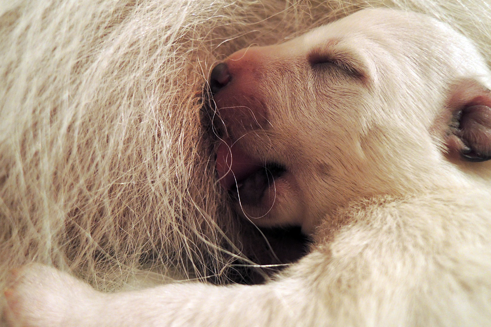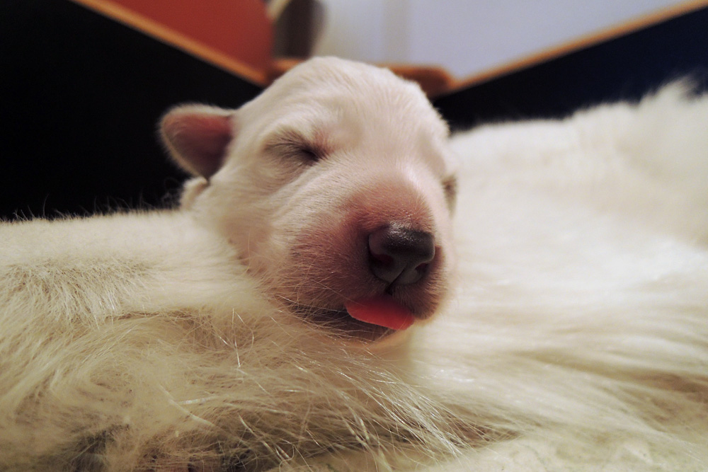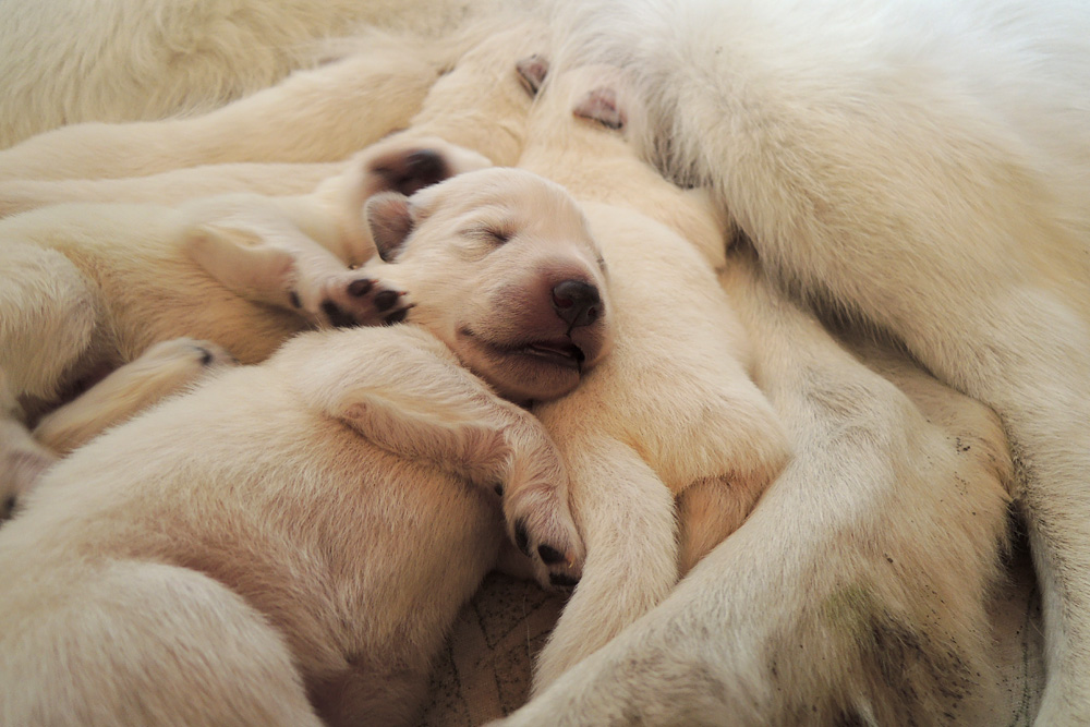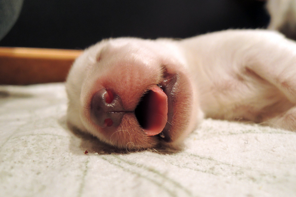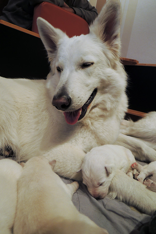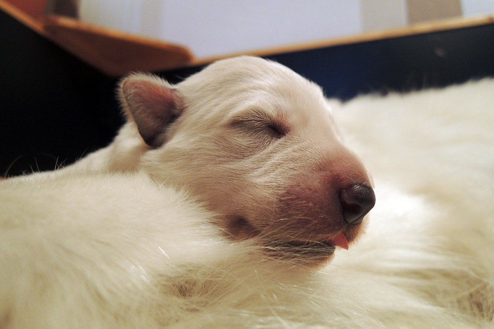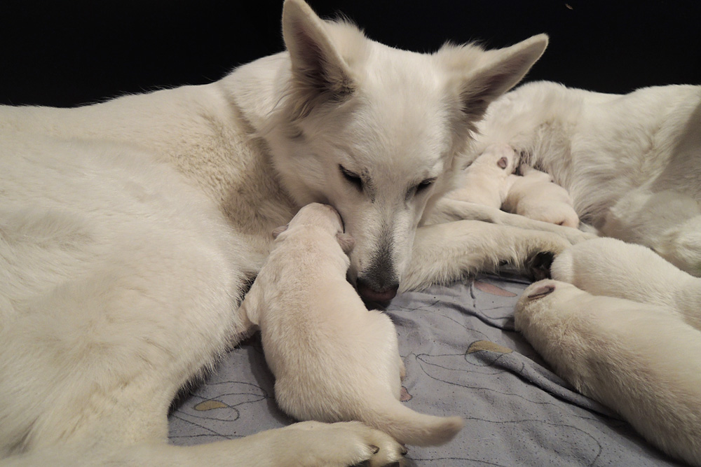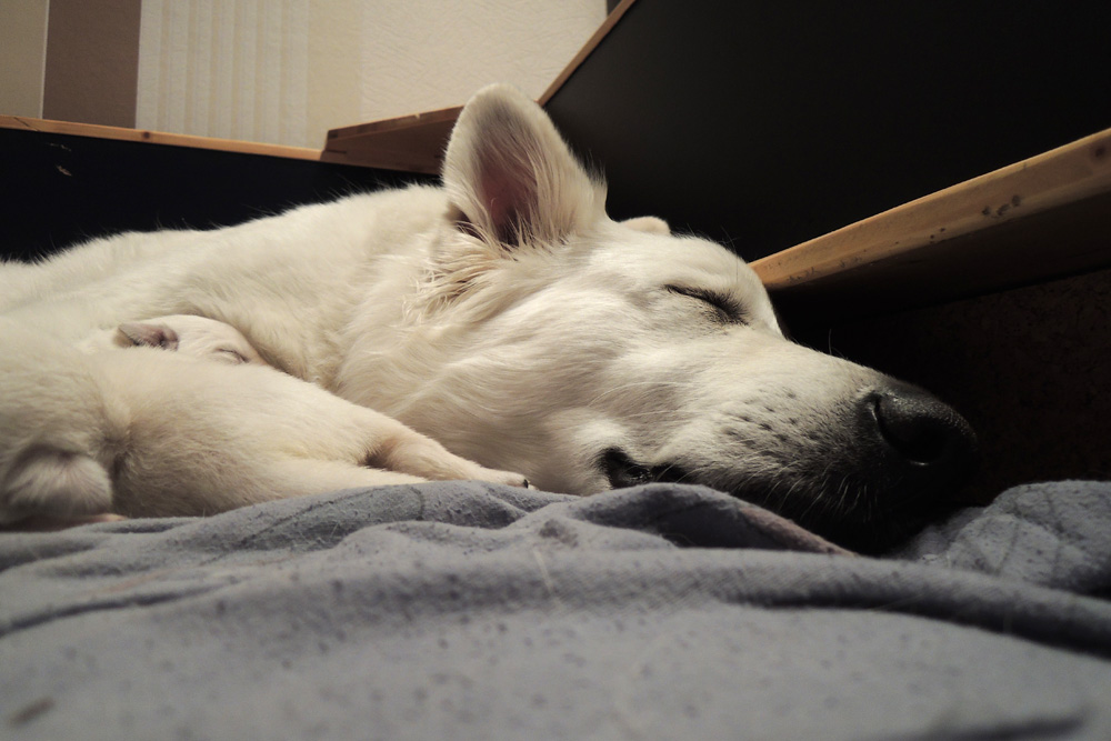 jeder ist schon eine kleine Persönlichkeit...so haben wir eine Krummpumpel Hexe...wenn der Dame etwas nicht passt, wird das nicht nur lautstark kommentiert, sondern mit kompletten Körpereinsatz Wiederspruch erhoben...wenn sie allerdings Satt und Zufrieden ist, dann kann sie Stundenlang schmusen... Unser anderes Mädchen ist dafür immer gaaaanz lieb und schmusig..ich muss immer aufpassen, dass Tante Nadine sie nicht heimlich einsteckt..löl. Bei den Jungs ist auch ein kleiner Schmuser dabei, na ja die anderen...öhm...wenn man will, Lust und Zeit hat, ist das OK, ansonsten kennen die nur "Fressen, schlafen, schei...en, und lautstark Protestieren, wenn die Milchbar nicht SOFORT zur Verfügung steht...Männer halt...la,la,la Ansonsten sind wir super zufrieden mit unserem Sixpack...das Geburtsgewicht ist bereits verdoppelt und alle sind so schön gleichmäßig und es sind seeeeehr agile Babys wenn sie wach sind, aber auch total ruhig und entspannt wenn Schlafenszeit ist. Isi geht dann immer schnell mit in den Garten und geht ihrem Lieblingshobby nach, wenn man Hausarrest hat und nicht spazieren gehen darf....Balli spielen...was sonst. Ich glaub, sie hätte auch nichts dagegen, wenn wir ne kleine Runde zum Hundeplatz fahren könnten...Isi halt!!!...löl. Isi hat jetzt auch Unterstützung von der Lotterie bekommen...Schnulli Bulli liegt (nur wenn wir dabei sind) immer mit in der Kiste und beschmust die Bobbels.. das sieht immer sooooo süüüüüüssss aus. So...jetzt kommen aber die Bilder