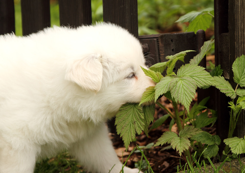 Yaro probiert derweil mal, wie die Blätter von den Himbeeren